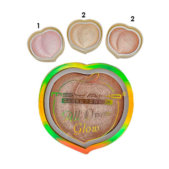 Iluminadores All Over Glow son perfectos para resaltar tus rostro, su presentación en forma de durazno y variedad de colores claros los vuelven los favoritos de todas.