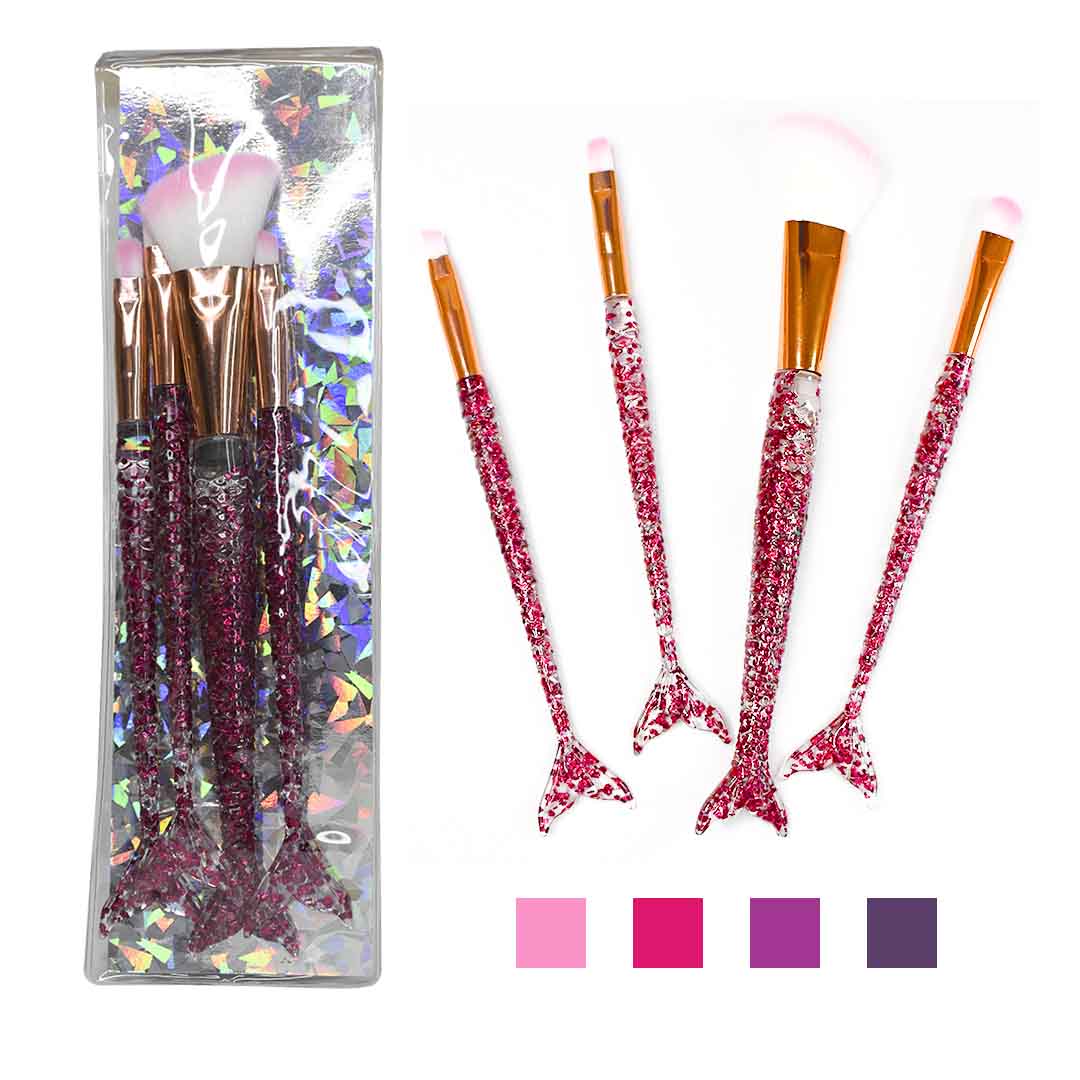 Set de 4 brochas en forma de sirena como decoración, incluyen glitter en el mango y es largo. Lleva 4 brochas de polvo, para ojos y para delineados.