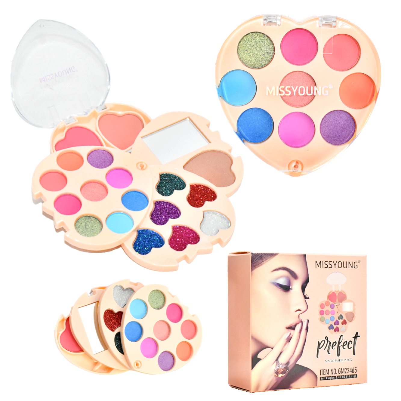 Sombra Desplegable en Forma de Corazon de 18 colores mas espejo. Es paleta es perfecta para introducirte en el mundo del maquillaje, cuenta con colores variados para que los puedas probar y lucir de una manera espectacular. Es una paleta compacta y útil para llevarla en viajes y estar siempre bella en cualquier momento.